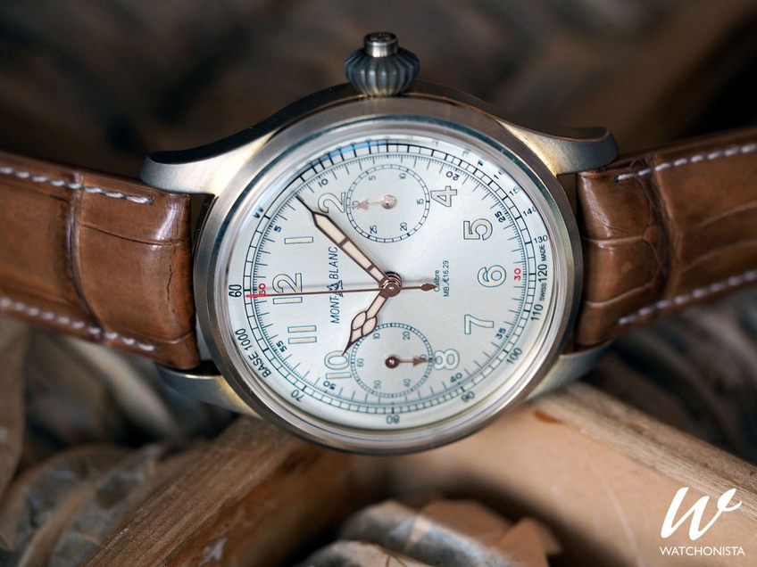 This Montblanc 1858 Automatic Dual Time is a classic design with retro-futurist accents: It features cathedral hands, luminescent Arabic numerals typical of the military typography of the interbellum period, and especially of the military watches made by Minerva during the Art-Deco era. Behind the retro look, however, beats a modern heart with automatic winding, the MB 29.19.